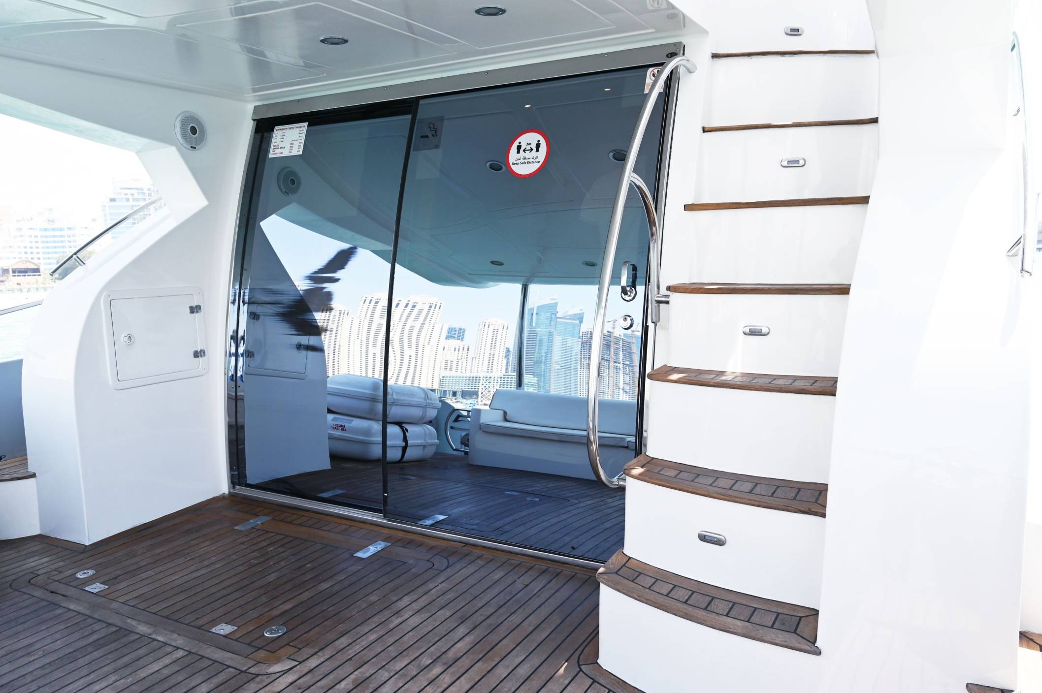 You will have plenty of comfortable outlooks to observe the sights and enjoy the yacht's flybridge, sun deck, outdoor seating area, and roomy internal amenities.